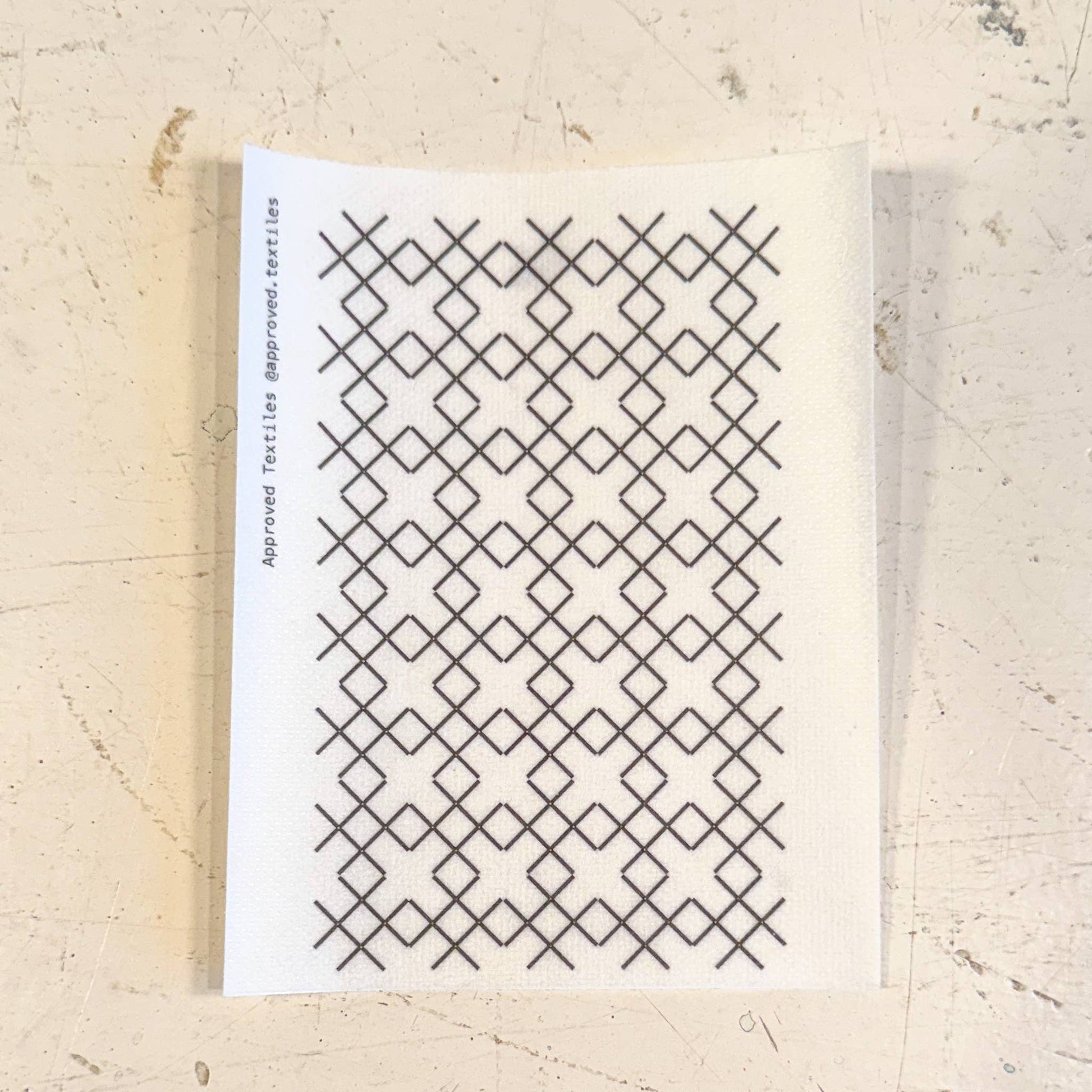 Structure as poetry. This minimalist transfer is for those who find beauty in repetition, tension, and quiet strength. Inspired by interlocking grids and woven forms, “Lattice” adds a sense of balance and subtle architecture to any stitchable surface.
