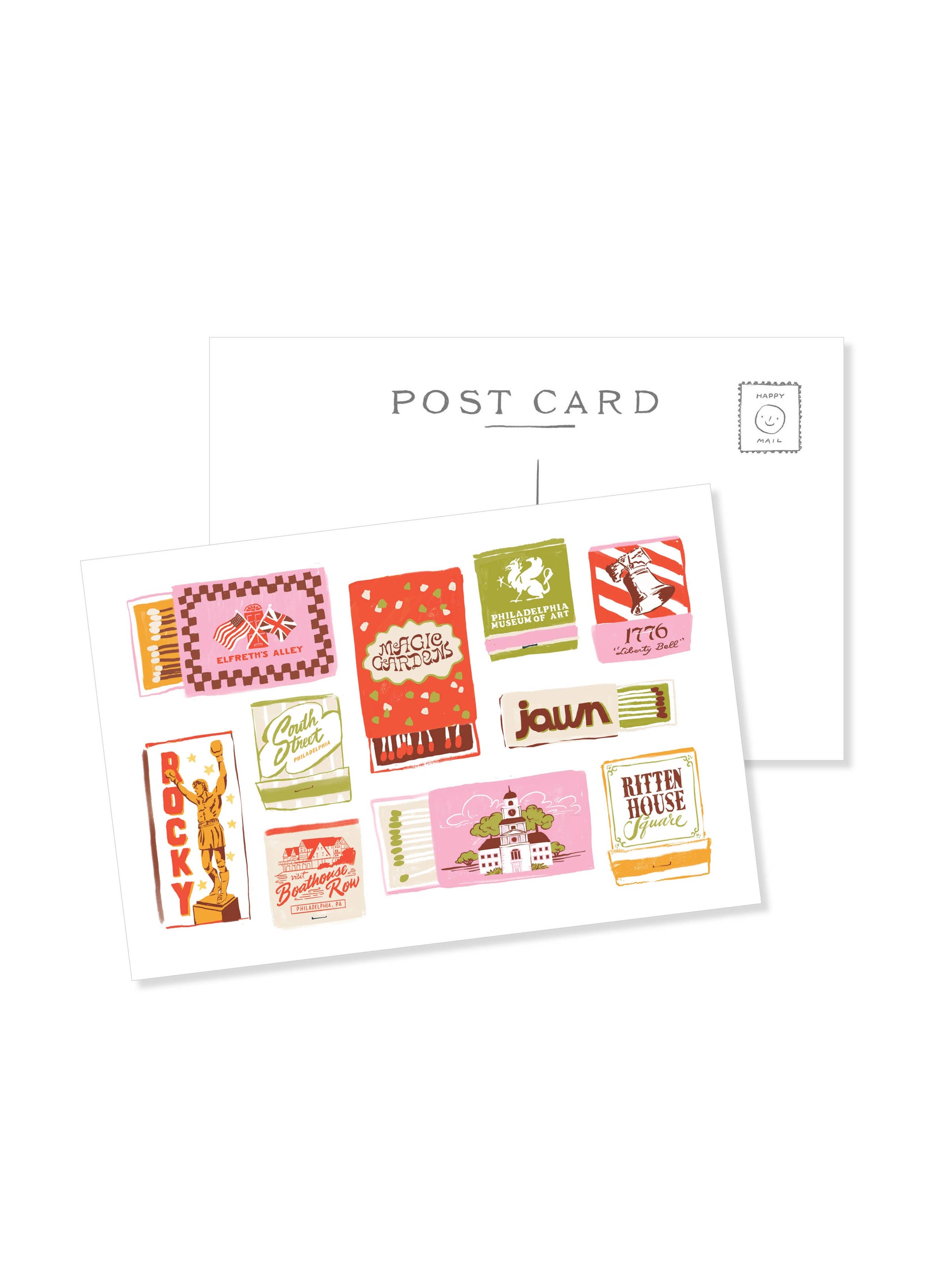 The Philly Matchbook Postcard features nostalgic, colorful matchbook illustrations of Philadelphia, PA icons on the front and space for a message and recipient address on the back.