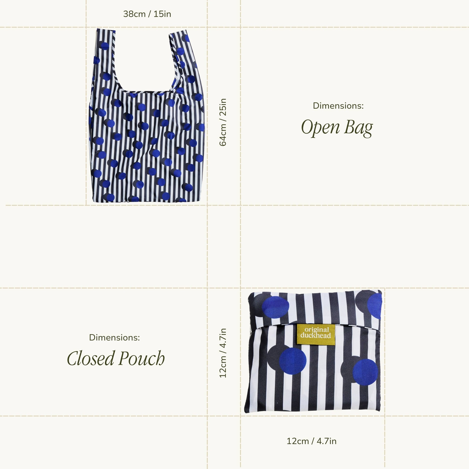 These sustainable & eco-friendly reusable bags are designed in London and handmade with care. 6 plastic bottles were recycled to make each bag. Upcycled Materials - 100% recycled vegan fabric. Built to last - 2-year warranty against manufacturing defects. Lightweight, compact, foldable, larger than Baggu and basic tote bags. Folds into a small, attached pouch, to fit into a pocket, handbag, or backpack. Water resistant. Strong, holds up to 20kg. Machine washable at 30 degrees. All packaging is fully recyclable and biodegradable.