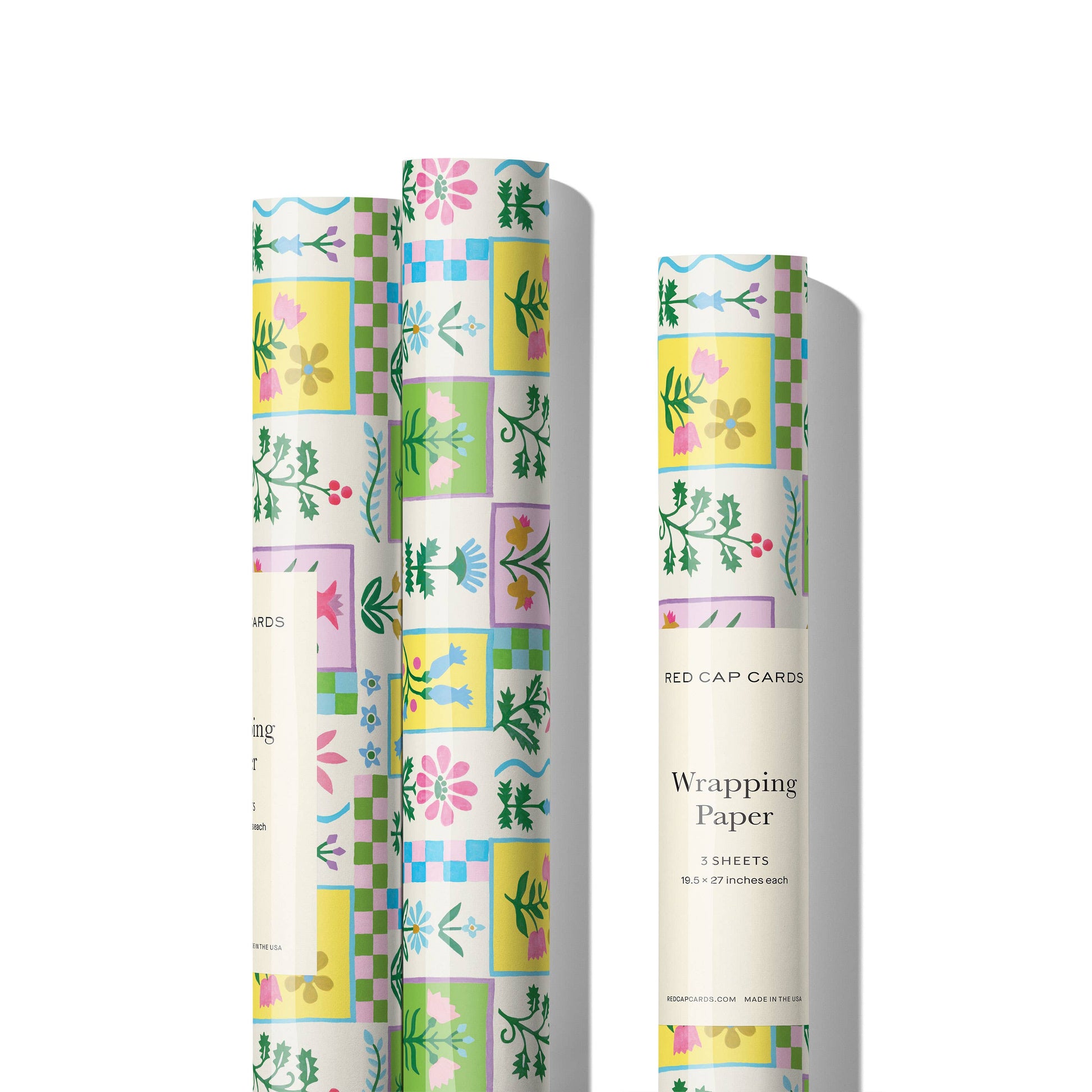 Sold as individual 19 x 27 inch sheets of flat wrap, or as 3 sheets rolled and sealed together in cellophane (without a cardboard core). Illustrated by Danielle Kroll. Printed by Red Cap Cards in Los Angeles, California, USA, on recycled paper.