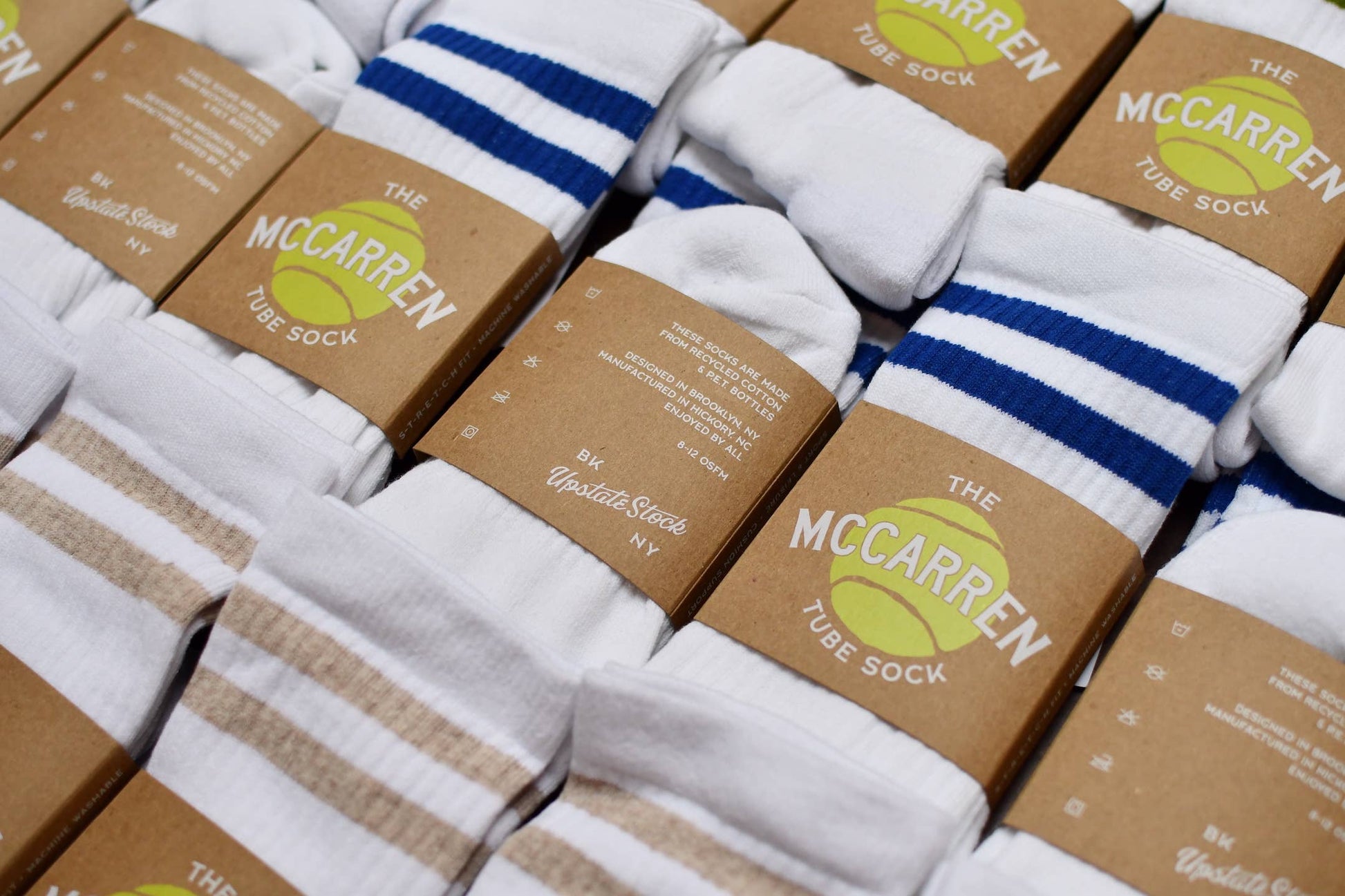 Thankfully, some of our friends in NC introduced us to a lovely little factory in Hickory & we got started on these socks right away. Just like our top selling eco-cotton watchcaps, these socks are made from recycled cotton & P.E.T. bottles.